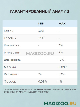 - Здоровые мочевыводящие пути: формула корма с невысоким содержанием минералов (особенно магния), помогает предотвратить образование кристаллов / камней в мочевом пузыре, а также регулирует pH мочи.