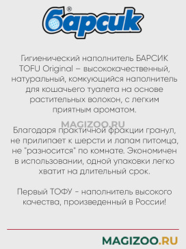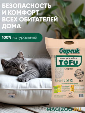 Гигиенический наполнитель БАРСИК TOFU Original – высококачественный, натуральный, комкующийся наполнитель для кошачьего туалета на основе растительных волокон, с легким приятным ароматом.