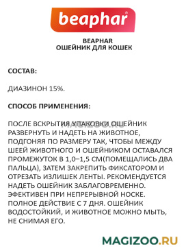 Использовать только для кошек. После манипуляций с ошейником необходимо тщательно вымыть руки с мылом. Запрещается выбрасывать использованный ошейник и упаковку в водоемы.