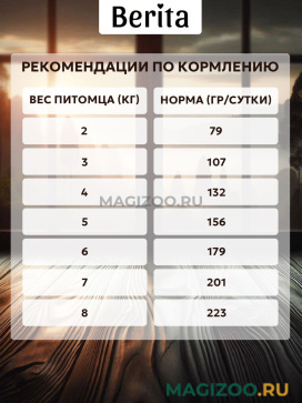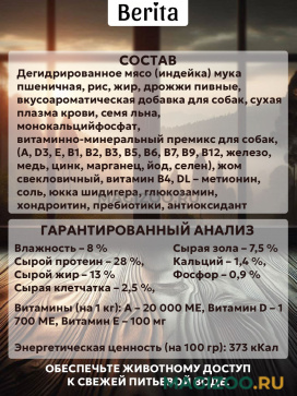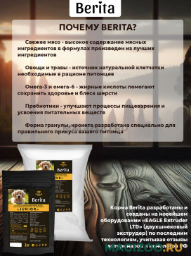 Корма Berita разработаны и созданы на новейшем оборудовании «EAGLE Extruder LTD» (двухшнековый экструдер) по последним технологиям, учитывая отзывы ветеринаров и кинологов РФ.