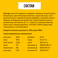 Дегидрированное мясо (индейка, говядина) мука пшеничная, жир, семя льна,