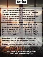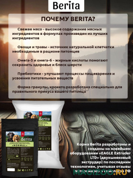 Корма Berita разработаны и созданы на новейшем оборудовании «EAGLE Extruder LTD» (двухшнековый экструдер) по последним технологиям, учитывая отзывы ветеринаров и кинологов РФ.