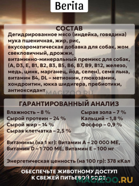 Корма Berita разработаны и созданы на новейшем оборудовании «EAGLE Extruder LTD» (двухшнековый экструдер) по последним технологиям, учитывая отзывы ветеринаров и кинологов РФ.