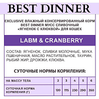 Информация о составе и ингредиентах, цветовом решении, технических и иных характеристиках, стране-изготовителе, внешнем виде и комплекте поставки товара носит справочный характер и основана на последних доступных к моменту публикации сведениях. Доставка данного товара осуществляется во все регионы РФ.Главной составляющей корма Best Dinner является свежее высококачественное мясо. Так как оно закупается производителем у поставщиков, проверенных годами сотрудничества, мясо гарантировано высокого качества и соответствует всем санитарным нормам. Корм Best Dinner прекрасно сбалансирован по всем питательным показателям – белки, жиры, углеводы, витамины и минералы – все вместе образуют полноценный корм для Вашего питомца. Консервы BEST DINNER не содержат: субпродукты, искусственные красители и консерванты, ГМО, гормоны и пр.