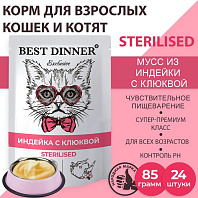 BEST DINNER EXCLUSIVE – это крупные волокна мяса в желе, приготовленное по рецепту, разработанному с учетом физиологических особенностей кастрированных котов и стерилизованных кошек для профилактики мочекаменной болезни.