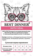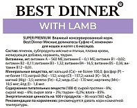 Информация о составе и ингредиентах, цветовом решении, технических и иных характеристиках, стране-изготовителе, внешнем виде и комплекте поставки товара носит справочный характер и основана на последних доступных к моменту публикации сведениях. Доставка данного товара осуществляется во все регионы РФ.Главной составляющей корма Best Dinner является свежее высококачественное мясо. Так как оно закупается производителем у поставщиков, проверенных годами сотрудничества, мясо гарантировано высокого качества и соответствует всем санитарным нормам. Корм Best Dinner прекрасно сбалансирован по всем питательным показателям – белки, жиры, углеводы, витамины и минералы – все вместе образуют полноценный корм для Вашего питомца. Консервы BEST DINNER не содержат: субпродукты, искусственные красители и консерванты, ГМО, гормоны и пр.