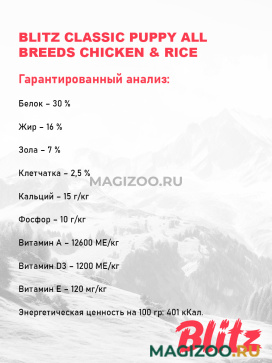 Корм BLITZ CLASSIC PUPPY CHICKEN & RICE является полнорационным — это значит, что он обогащён всеми необходимыми для собак макро- и микроэлементами, сбалансирован по белкам/жирам и пр. показателям. Вводить щенкам дополнительные добавки не требуется.
