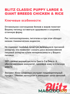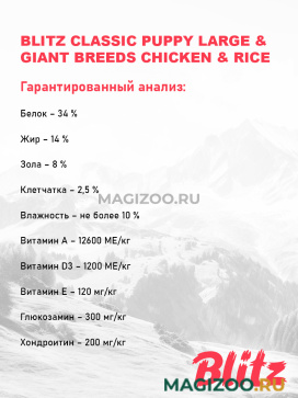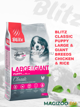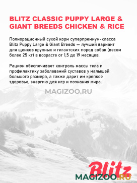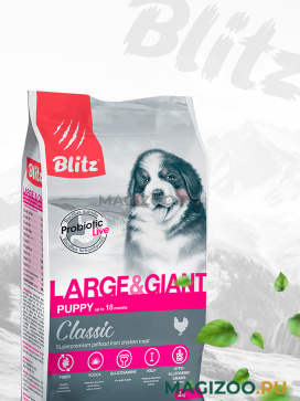 Полнорационный сухой корм суперпремиум-класса Blitz Puppy Large & Giant Breeds — лучший вариант для щенков крупных и гигантских пород собак (весом более 25 кг) в возрасте от 1,5 до 19 месяцев. Рацион обеспечивает контроль массы тела и профилактику заболеваний суставов у малышей большого размера, а также дарит им крепкое здоровье, энергию для игр и познания мира.