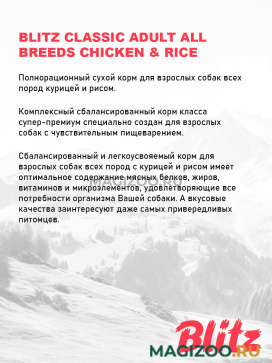 Корма BLITZ созданы в России с учётом международного опыта в производстве экструдированных кормов для собак и кошек. Рецепты, разработанные профессиональными технологами и ветеринарными специалистами, выпускаются на современном импортном оборудовании из сырья высокого качества. При создании кормов учитываются современные тенденции, а потому BLITZ не содержит пшеницу и сою, которые могут вызвать пищевую аллергию.