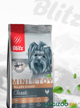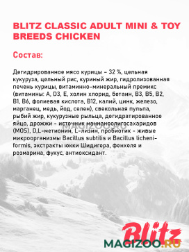Сбалансированный состав корма BLITZ ADULT MINI & TOY BREEDS создан в соответствии с особыми требованиями взрослых собак мелких и миниатюрных пород весом до 10 кг.
