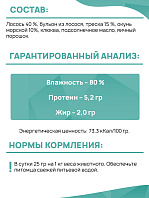 Мясо и субпродукты (в т.ч. кролик не менее 15 %, курица не менее 10 %, сердца куриные не менее 10 %, коллагеновая эмульсия не менее 10 %, печень куриная не менее 5 %), гидролизат куриного белка, клетчатка, витамины группы B, РР, K, Na, Mg, Fe, Cu, I, Se, Са и Р (1 / 0,8).