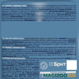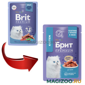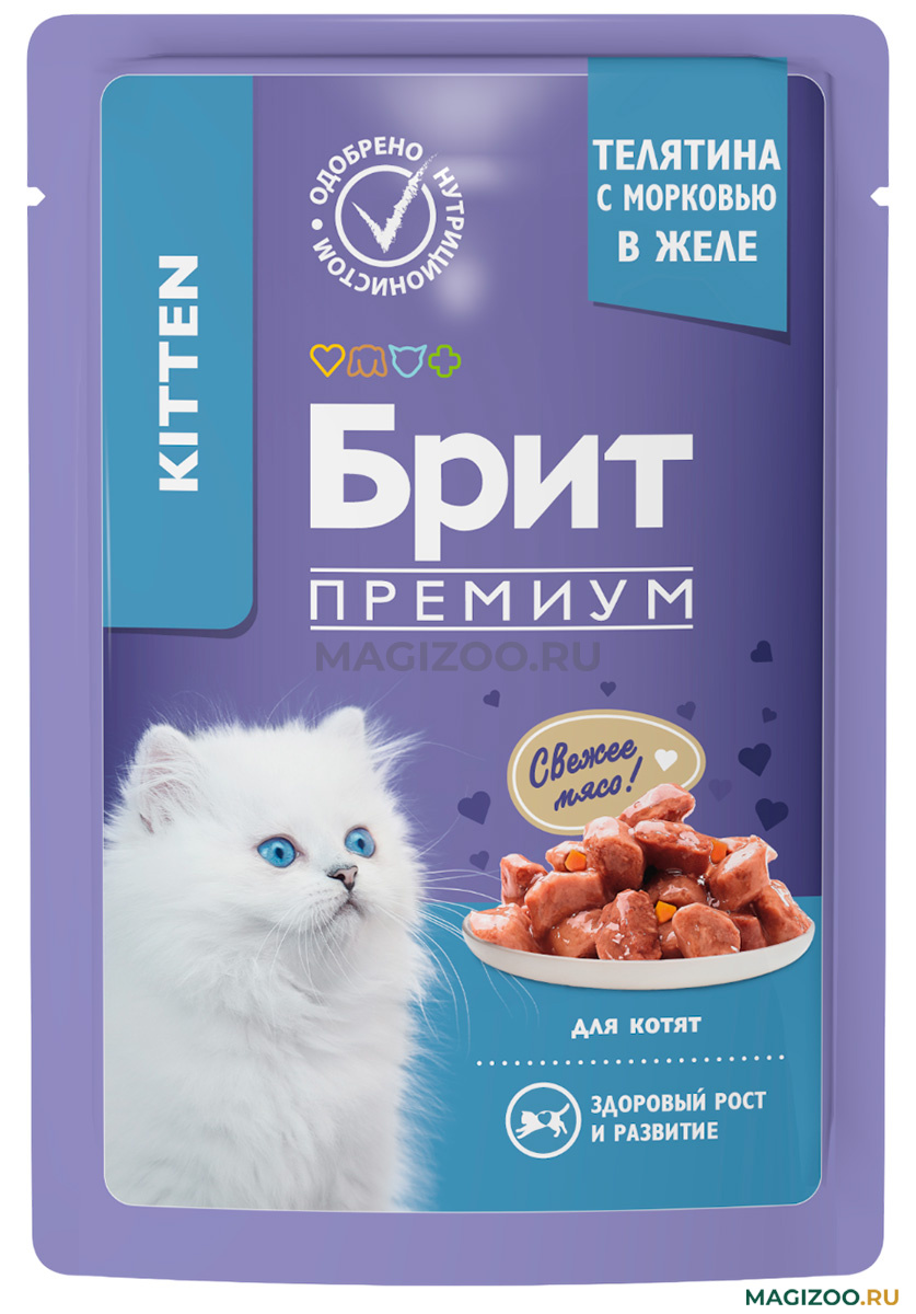 Полнорационный влажный корм Brit Premium для котят c телятиной и морковью в желе.