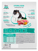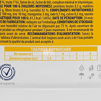 Мясо и мясные субпродукты 60 %, рыба и рыбные субпродукты 15 % ( в том числе лосось 8 %, форель 7 %) мука рисовая, мука пшеничная, минерально-витаминный комплекс, загуститель.