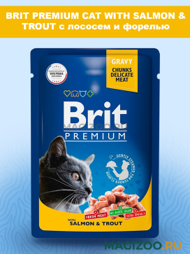 Полнорационный влажный корм премиум – класса для взрослых кошек с лососем и форелью в соусе. Кошки - большие гурманы и очень любят разнообразие в своем рационе. Именно для них, а также для кошек, у которых не очень хороший аппетит, создана линейка консервов BRIT PREMIUM с разнообразными вкусами.