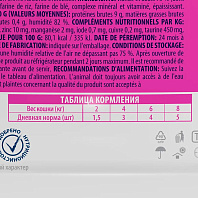Мясо и мясные субпродукты 75 %, (в том числе мясо цыплят 5 %, мясо перепелки 5 %), мука рисовая, мука пшеничная, минерально-витаминный комплекс, загуститель.