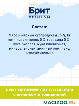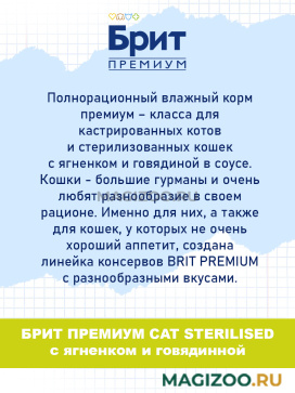 Полнорационный влажный корм премиум – класса для кастрированных котов и стерилизованных кошек с ягненком и говядиной в соусе.