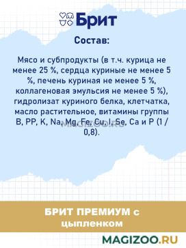 Информация о составе и ингредиентах, цветовом решении, технических и иных характеристиках, стране-изготовителе, внешнем виде и комплекте поставки товара носит справочный характер и основана на последних доступных к моменту публикации сведениях. Доставка данного товара осуществляется во все регионы РФ.Здоровье питомца является главным принципом компании Brit-VAFO PRAHA. Корма под брендом BRIT производятся исключительно из натуральных и легко усваиваемых ингредиентов. В составе продукции нет сои и ГМО.