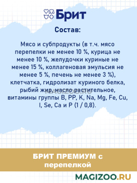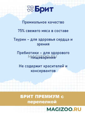 Информация о составе и ингредиентах, цветовом решении, технических и иных характеристиках, стране-изготовителе, внешнем виде и комплекте поставки товара носит справочный характер и основана на последних доступных к моменту публикации сведениях. Доставка данного товара осуществляется во все регионы РФ.Здоровье питомца является главным принципом компании Brit-VAFO PRAHA. Корма под брендом BRIT производятся исключительно из натуральных и легко усваиваемых ингредиентов. В составе продукции нет сои и ГМО.
