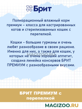 Полнорационный влажный корм премиум – класса для кастрированных котов и стерилизованных кошек с перепелкой.