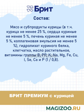 Информация о составе и ингредиентах, цветовом решении, технических и иных характеристиках, стране-изготовителе, внешнем виде и комплекте поставки товара носит справочный характер и основана на последних доступных к моменту публикации сведениях. Доставка данного товара осуществляется во все регионы РФ.Здоровье питомца является главным принципом компании Brit-VAFO PRAHA. Корма под брендом BRIT производятся исключительно из натуральных и легко усваиваемых ингредиентов. В составе продукции нет сои и ГМО.