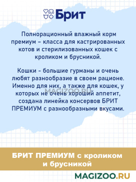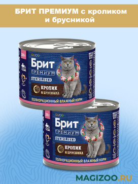 Полнорационный влажный корм премиум – класса для кастрированных котов и стерилизованных кошек с кроликом и брусникой.