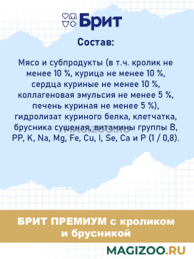 Мясо и субпродукты (в т.ч. кролик не менее 10 %, курица не менее 10 %, сердца куриные не менее 10 %, коллагеновая эмульсия не менее 5 %, печень куриная не менее 5 %), гидролизат куриного белка, клетчатка, брусника сушеная, витамины группы B, РР, K, Na, Mg, Fe, Cu, I, Se, Са и Р (1 / 0,8).