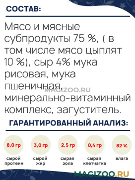 Мясо и мясные субпродукты 75 %, ( в том числе мясо цыплят 10 %), сыр 4% мука рисовая, мука пшеничная, минерально-витаминный комплекс, загуститель.