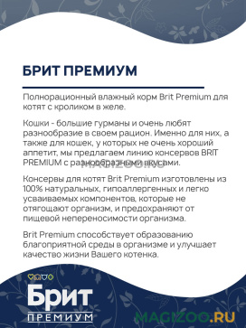 Информация о составе и ингредиентах, цветовом решении, технических и иных характеристиках, стране-изготовителе, внешнем виде и комплекте поставки товара носит справочный характер и основана на последних доступных к моменту публикации сведениях. Доставка данного товара осуществляется во все регионы РФ.Здоровье питомца является главным принципом компании Brit-VAFO PRAHA. Корма под брендом BRIT производятся исключительно из натуральных и легко усваиваемых ингредиентов. В составе продукции нет сои и ГМО.