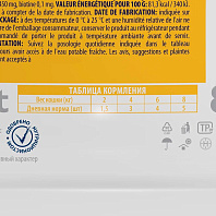 Мясо и мясные субпродукты 75 %, ( в том числе мясо индейки 10 %), сыр 4% мука рисовая, мука пшеничная, минерально-витаминный комплекс, загуститель.