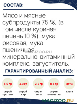 Мясо и мясные субпродукты 75 %, (в том числе куриная печень 10 %), мука рисовая, мука пшеничная, минерально-витаминный комплекс, загуститель.