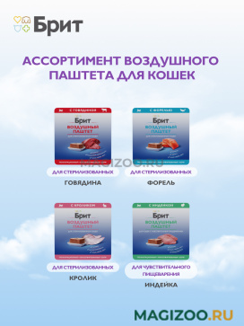 Воздушные паштеты Брит могут использоваться на постоянной основе для сбалансированного питания кошек и собак, так как содержат все необходимые для питомца питательные вещества, витамины и микроэлементы.