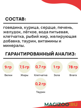 Состав: говядина, курица, сердце, печень, желудок, лёгкое, вода питьевая, клетчатка, рыбий жир, желирующая добавка, таурин, витамины и минералы.