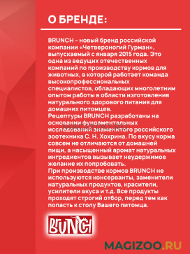 Информация о составе и ингредиентах, цветовом решении, технических и иных характеристиках, стране-изготовителе, внешнем виде и комплекте поставки товара носит справочный характер и основана на последних доступных к моменту публикации сведениях. Доставка данного товара осуществляется во все регионы РФ.Рецептуры BRUNCH разработаны на основании фундаментальных исследований знаменитого российского зоотехника С. Н. Хохрина. По вкусу корма совсем не отличаются от домашней пищи, а насыщенный аромат натуральных ингредиентов вызывает неудержимое желание их попробовать.