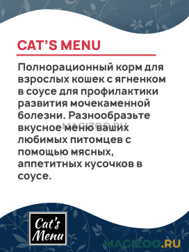 Полнорационный корм для взрослых кошек с ягненком в соусе для профилактики развития мочекаменной болезни. Разнообразьте вкусное меню ваших любимых питомцев с помощью мясных, аппетитных кусочков в соусе.