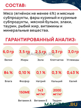 Мясо (ягнёнок не менее 4%) и мясные субпродукты, фарш куриный и куриные субпродукты, мясной бульон, злаки, таурин, рыбий жир, витамины и минеральные вещества.