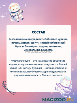 Кусочки в соусе — это изысканное сочетание вкусов, которое непременно понравится Вашей кошке или котику. Курочка — источник белка и аминокислот, необходимых для поддержания здоровья и активности Вашего питомца.