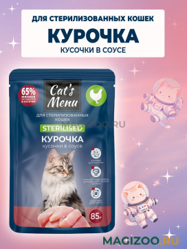 Откройте мир заботы о Вашей кошке с Cat's Menu! Наш пауч для взрослых стерилизованных кошек с курочкой — это вкусное и полезное лакомство, созданное специально для поддержания здоровья и активности вашего пушистого друга.