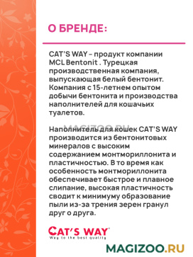 Благодаря белым минералам бентонита, которые символизируют чистоту, свежесть и гигиену, наполнитель CAT'S WAY BABYPOWDER создает комфортные условия для Вашей кошки.