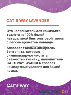 CAT'S WAY LAVANDER - это наполнитель для кошачьего туалета из 100% белой натуральной бентонитовой глины с легким ароматом лавандвы.