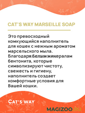 CAT'S WAY MARSEILLE SOAP - это наполнитель для кошачьего туалета из 100% белой натуральной бентонитовой глины с ароматом марсельского мыла.
