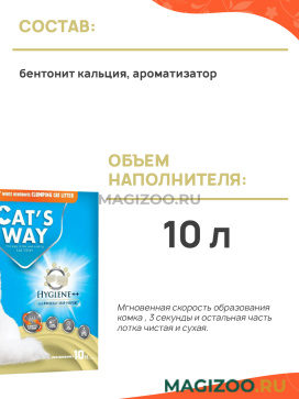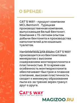 Информация о составе и ингредиентах, цветовом решении, технических и иных характеристиках, стране-изготовителе, внешнем виде и комплекте поставки товара носит справочный характер и основана на последних доступных к моменту публикации сведениях. Доставка данного товара осуществляется во все регионы РФ.Наполнитель для кошек CAT’S WAY производится из бентонитовых минералов с высоким содержанием монтмориллонита и пластичностью. В то время как особенность монтмориллонита обеспечивает быстрое и плавное слипание, высокая пластичность сводит к минимуму образование пыли из-за трения зерен гранул друг о друга.