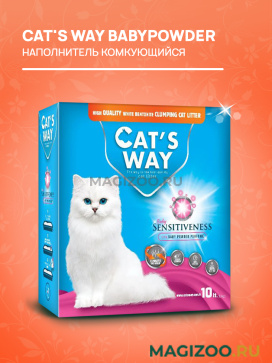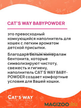 CAT'S WAY BABYPOWDER - это наполнитель для кошачьего туалета из 100% белой натуральной бентонитовой глины с легким ароматом детской присыпки.