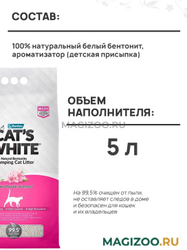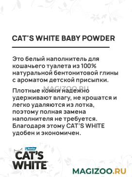 Cat's White Baby Powder - это белый наполнитель для кошачьего туалета из 100% натуральной бентонитовой глины с ароматом детской присыпки.