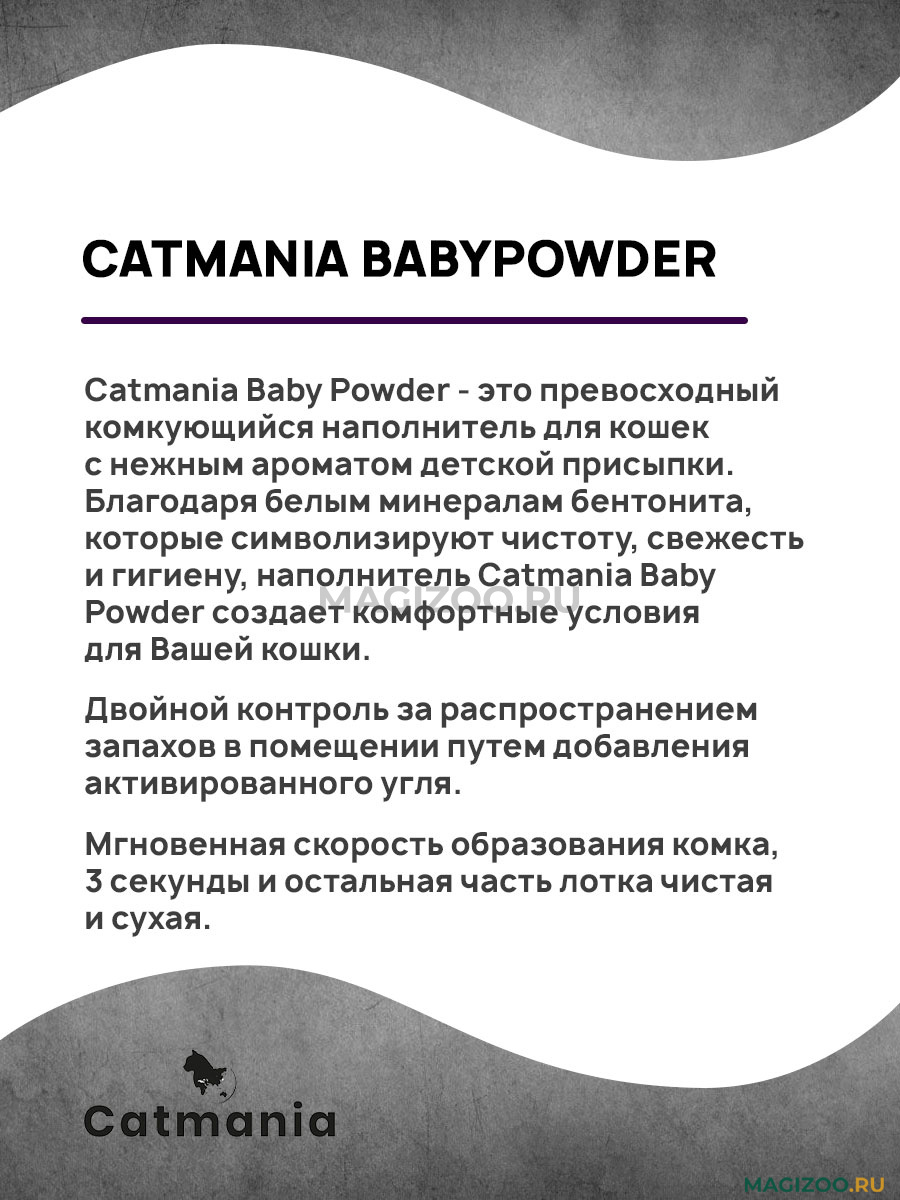 Catmania Baby Powder - это превосходный комкующийся наполнитель для кошек с нежным ароматом детской присыпки. Благодаря белым минералам бентонита, которые символизируют чистоту, свежесть и гигиену, наполнитель Catmania Baby Powder создает комфортные условия для Вашей кошки.