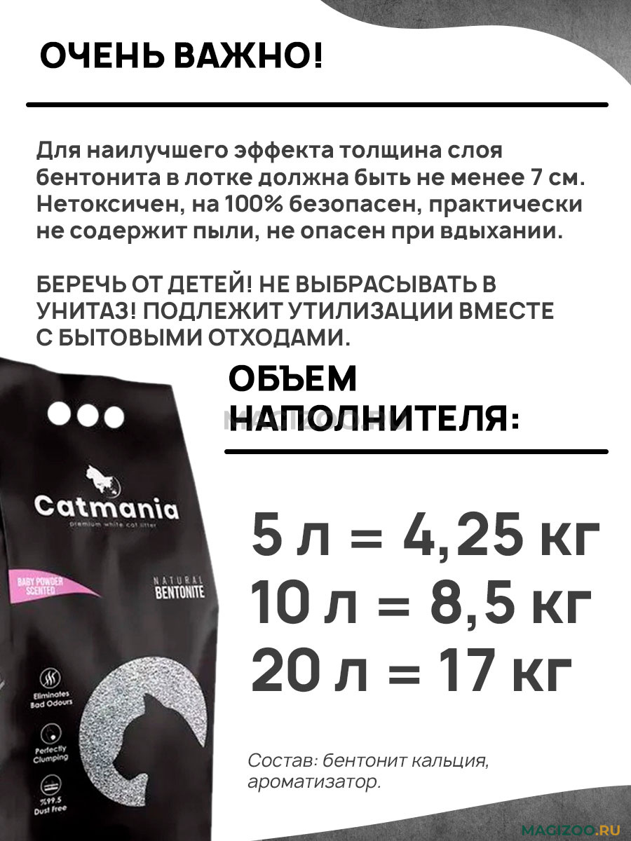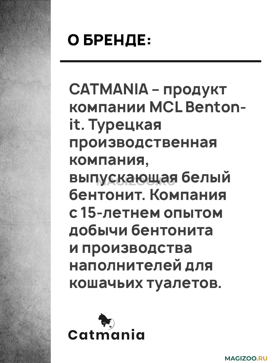 Информация о составе и ингредиентах, цветовом решении, технических и иных характеристиках, стране-изготовителе, внешнем виде и комплекте поставки товара носит справочный характер и основана на последних доступных к моменту публикации сведениях. Доставка данного товара осуществляется во все регионы РФ.Наполнитель для кошек Catmania производится из бентонитовых минералов с высоким содержанием монтмориллонита и пластичностью. В то время как особенность монтмориллонита обеспечивает быстрое и плавное слипание, высокая пластичность сводит к минимуму образование пыли из-за трения зерен гранул друг о друга.