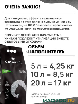 Информация о составе и ингредиентах, цветовом решении, технических и иных характеристиках, стране-изготовителе, внешнем виде и комплекте поставки товара носит справочный характер и основана на последних доступных к моменту публикации сведениях. Доставка данного товара осуществляется во все регионы РФ.Наполнитель для кошек Catmania производится из бентонитовых минералов с высоким содержанием монтмориллонита и пластичностью. В то время как особенность монтмориллонита обеспечивает быстрое и плавное слипание, высокая пластичность сводит к минимуму образование пыли из-за трения зерен гранул друг о друга.