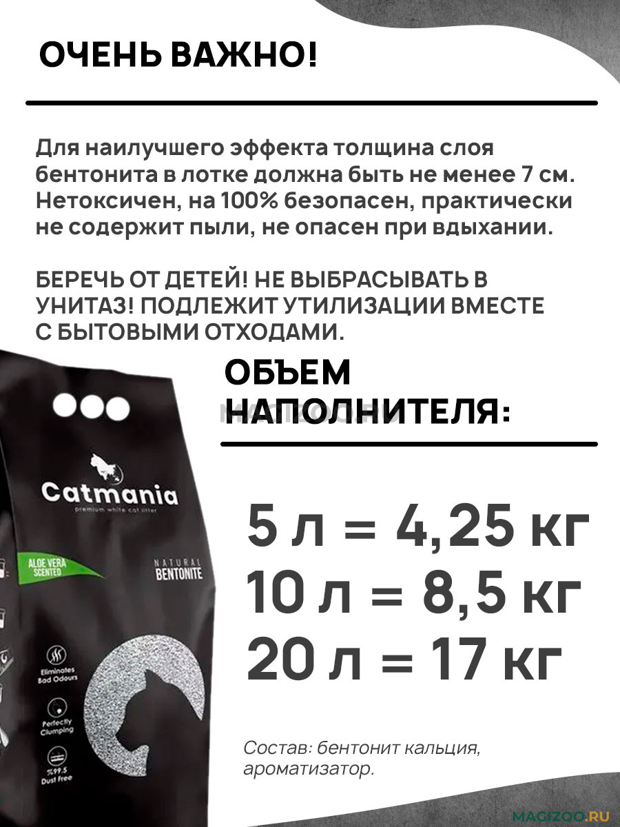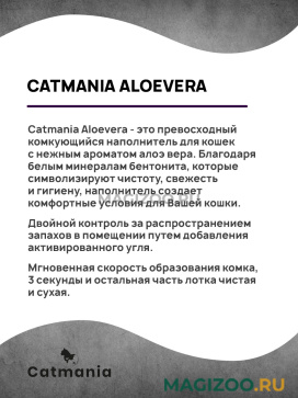 Catmania Aloevera - это белый наполнитель для кошачьего туалета из 100% белой натуральной бентонитовой глины с ароматом алоэ вера.