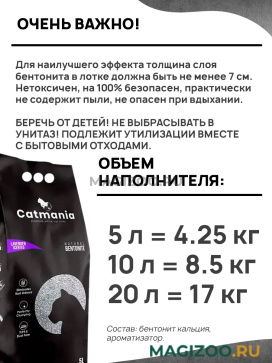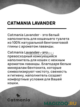 Catmania Lavander - это белый наполнитель для кошачьего туалета из 100% натуральной бентонитовой глины с ароматом лаванды.