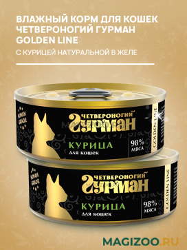 Четвероногий гурман Golden line для кошек – это влажный корм суперпремиум-класса, приготовленный из одного вида мяса качества Human grade (пригодного в пищу человеку) без добавления субпродуктов, зерновых и сои.