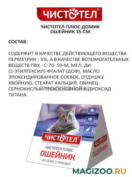 Чистотел плюс ошейник применяют для уничтожения блох, власоедов и иксодовых клещей, паразитирующих на кошках. Постоянное ношение ошейника обеспечивает защиту от иксодовых клещей на протяжении 3 месяцев, от насекомых - на протяжении 4 месяцев.